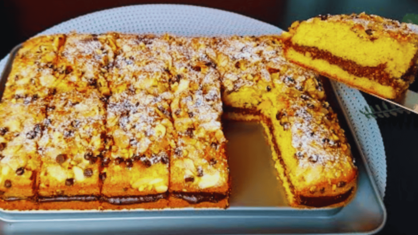 Просіяти борошно разом із розпушувачем та поступово ввести в рідку основу. Замісити однорідне тісто без грудочок. Перелити тісто у форму діаметром 18–27 см, змащену олією або застелену пергаментом. За бажанням, посипати верх горіхами, шоколадною крихтою чи мигдальними пластівцями. Випікати при 180°C близько 30 хвилин. Остудити, а потім розрізати корж на два пласти.
