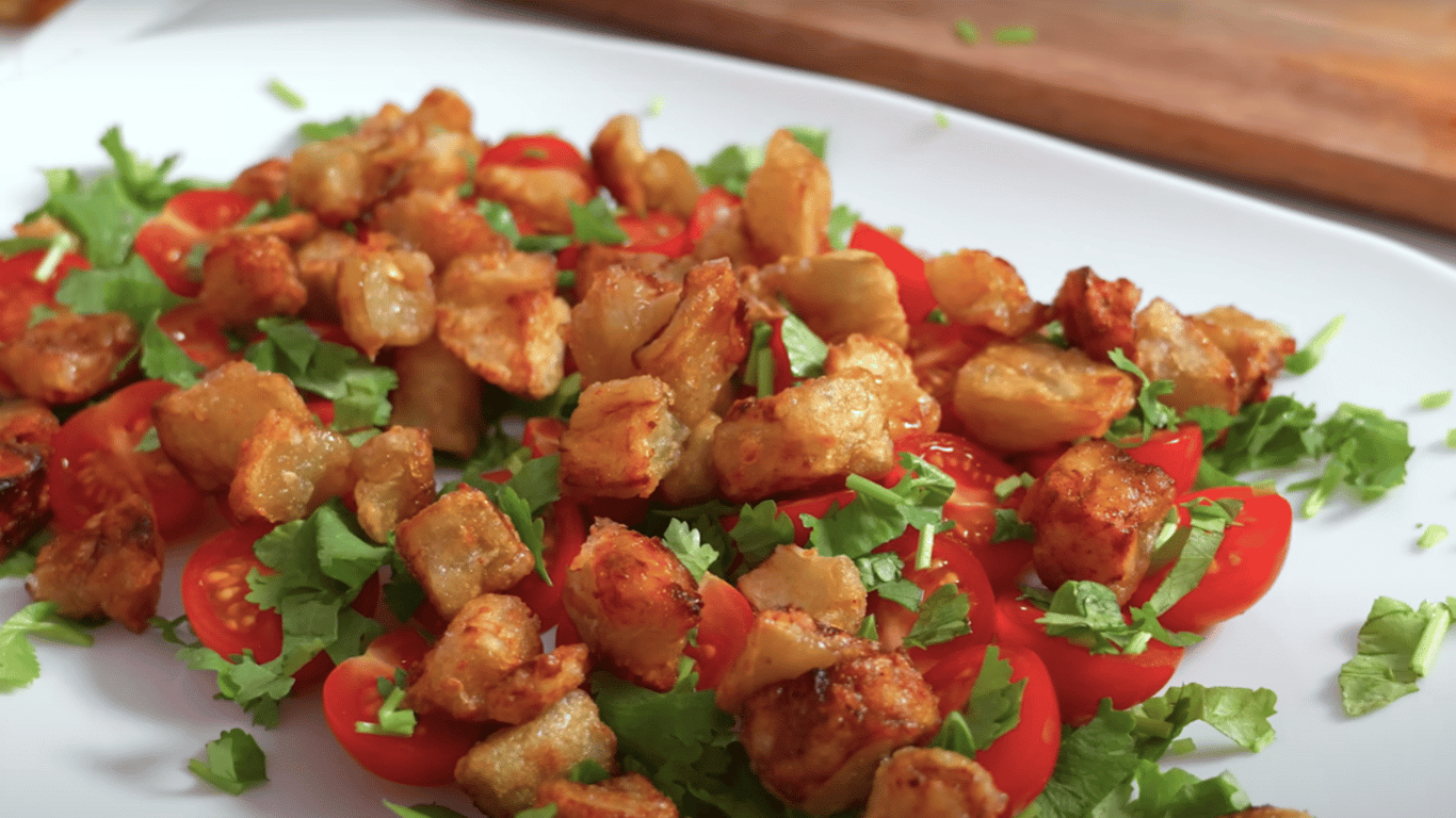 This crispy eggplant salad is a bright combination of golden eggplant slices, juicy tomatoes, and fresh cilantro, all with a sweet and sour chili flavor. This visually appealing dish has a distinct flavor and easily becomes a favorite.