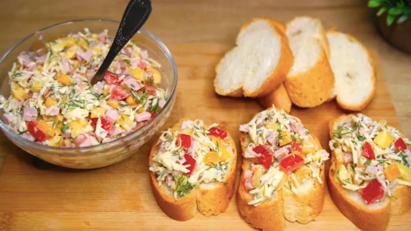 На скибочки білого хліба або шматочки багета викласти щедрий шар начинки. Викласти бутерброди на деко, застелене пергаментом. Випікати при температурі 180°C близько 10 хвилин, поки сир не розплавиться, а краї хліба не стануть золотистими.