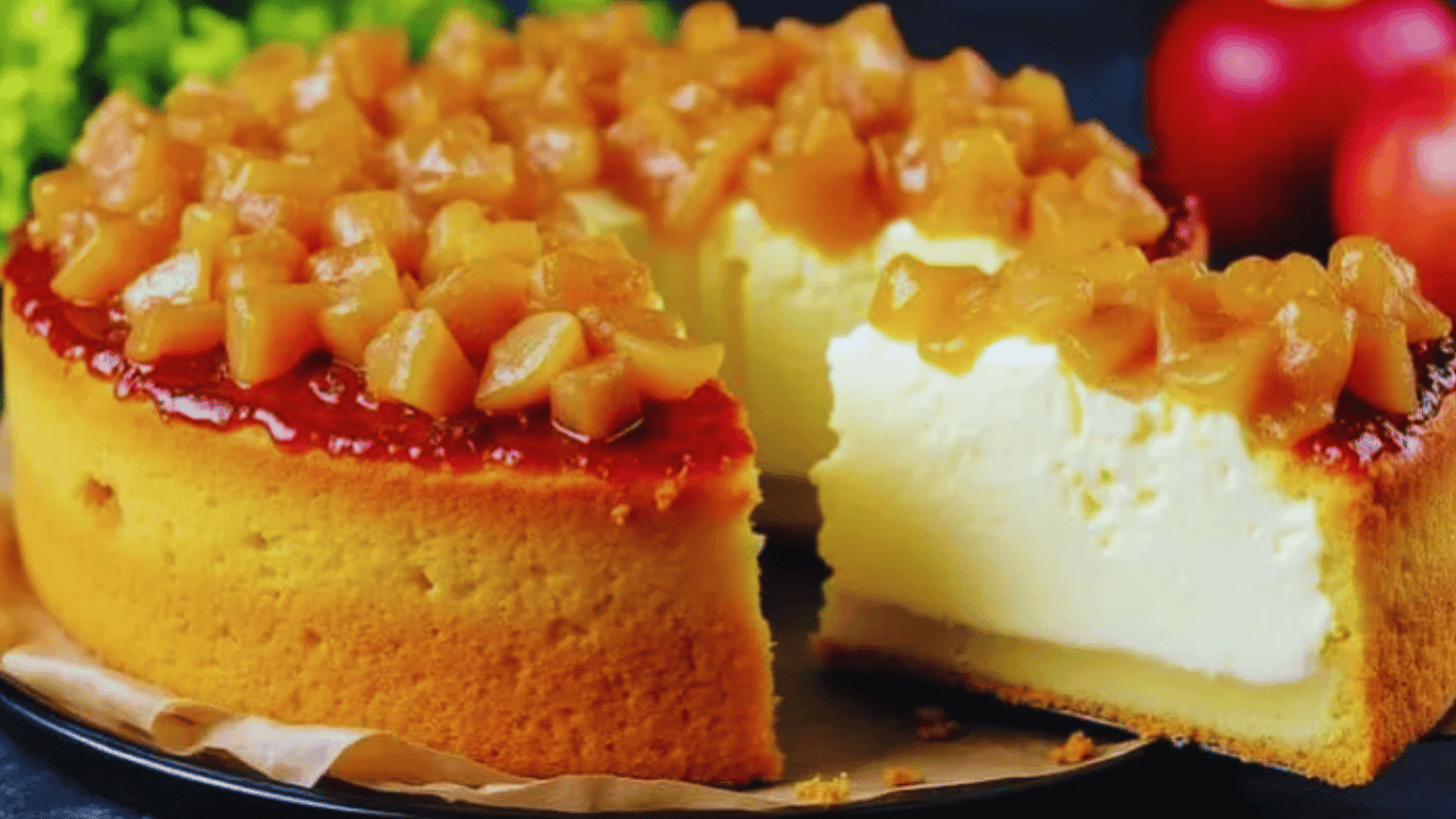 Яблучний пиріг який затьмарив шарлотку поєднує хрустку основу, ніжну сирну масу та карамельні яблука з корицею. Аромат теплий і затишний, кожен шматок тримає форму та тане в роті. Десерт виглядає святково й легко стає улюбленцем сімейних чаювань.