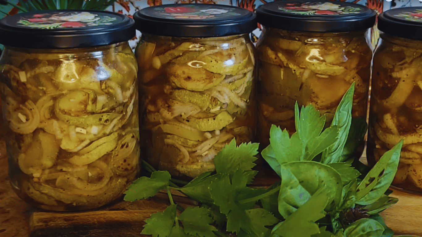 Кабачки на зиму як шашлик — золотисті кружальця в пряному маринаді, що нагадує смак літнього пікніка. Цибуля й часник додають аромату, приправа для шашлику додає пікантності, а шматочки залишаються щільними навіть після зберігання.