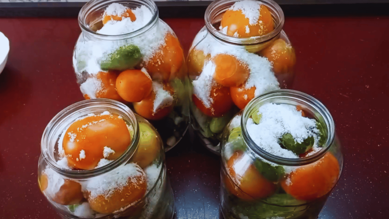 Укласти вертикально огірки, щільно, але без надмірного тиску. Додати трохи зелені між огірками. Поверх викласти щільні помідори — сливки, чері або коктейльні. Додати сіль із розрахунку 1 ст. л. на кожен літр об’єму банки — просто зверху.