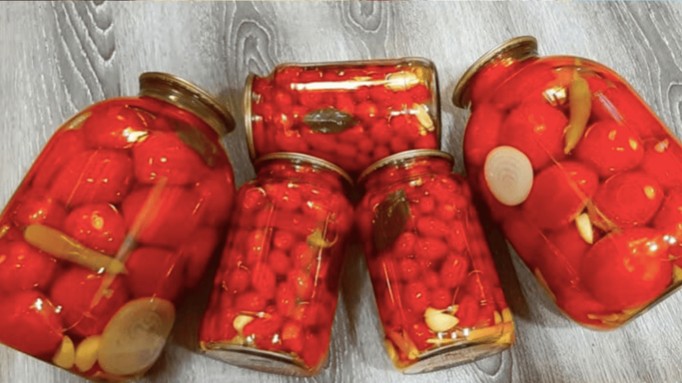 У чисті банки викласти зубчики часнику, частину помідорів, гострий перець, знову помідори, кружальця цибулі, лавровий лист, а зверху — решту томатів.