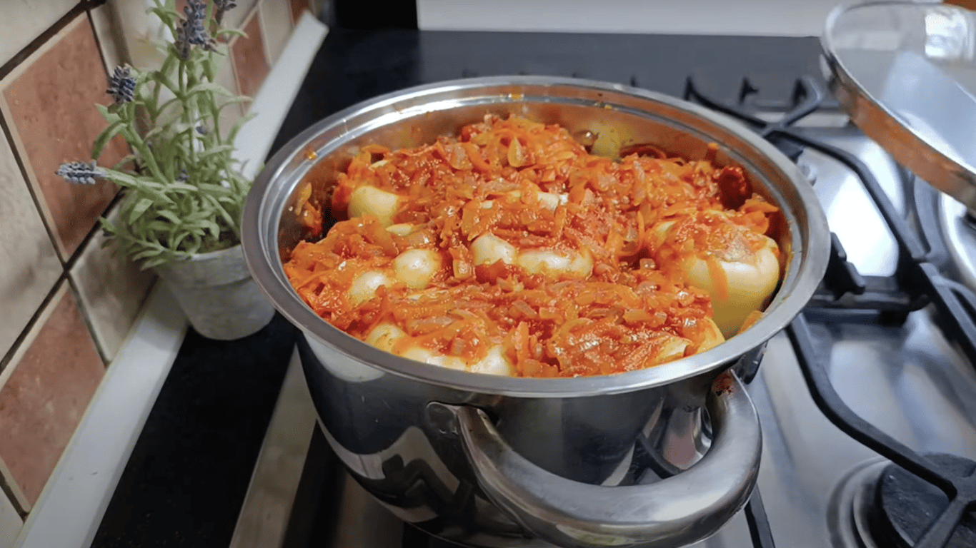 Лук нарезать кубиками и обжарить на растительном масле до золотистого оттенка. Добавить натертую морковь, перемешать и дать овощам потомиться. Помидоры надрезать крест-накрест, ошпарить кипятком, снять кожицу и натереть на терке. Половину поджарки оставить для фарша, вторую — использовать для соуса.