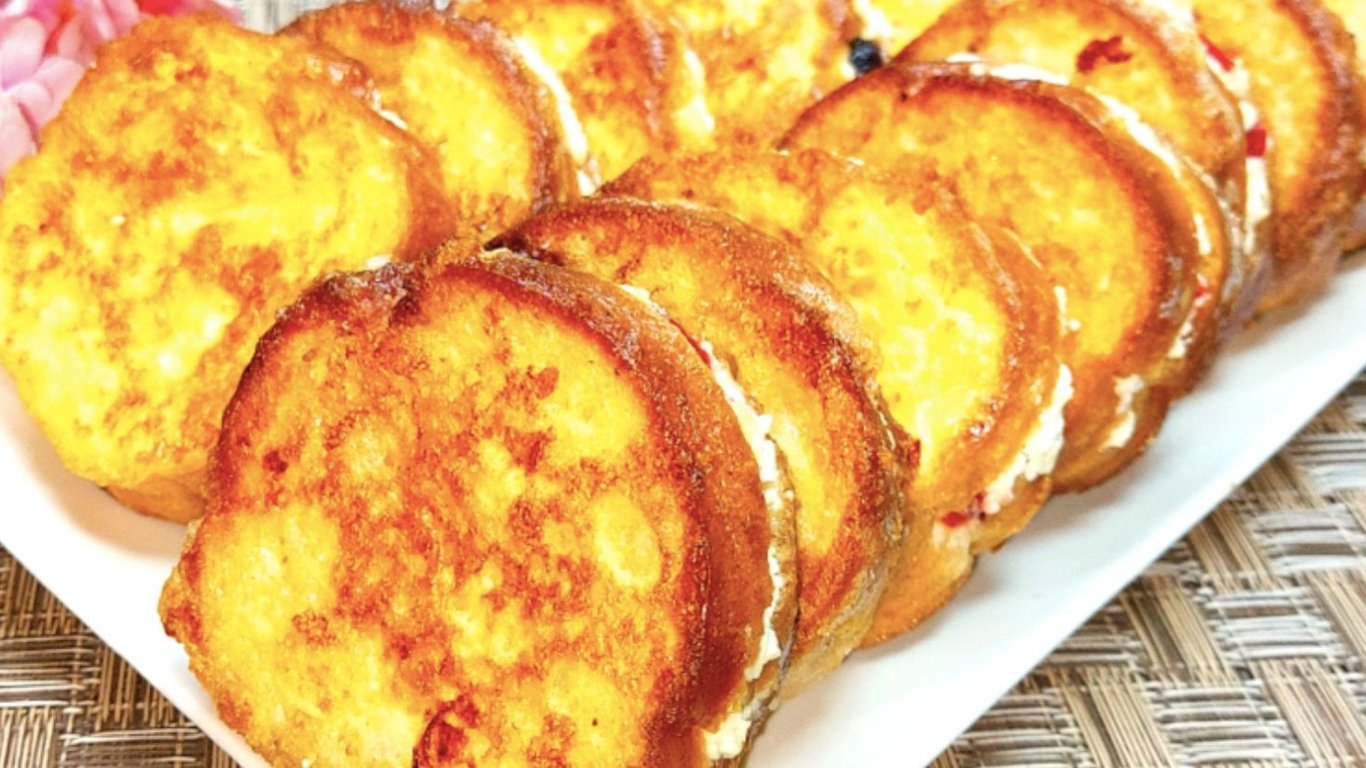 Каждый кусочек батона наполнить творожной начинкой, окунуть в кляр и обжарить на разогретом сливочном масле с обеих сторон до золотистой корочки. Подавать горячими, по желанию дополнить медом или ягодами.