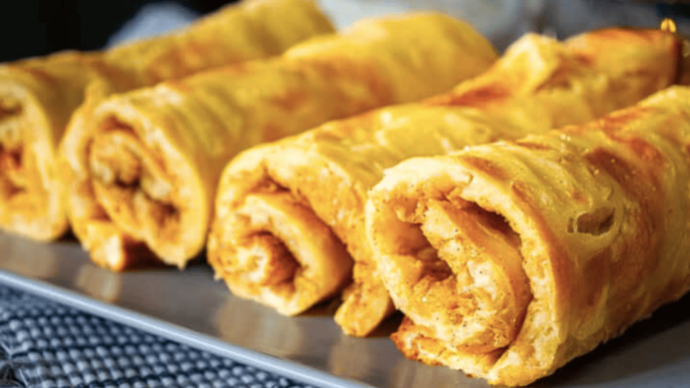 Горячий пласт посыпать смесью сахара и корицы, по желанию сбрызнуть растопленным сливочным маслом. Разрезать на 6 частей, каждую свернуть рулетиком и подать с медом или сметаной.