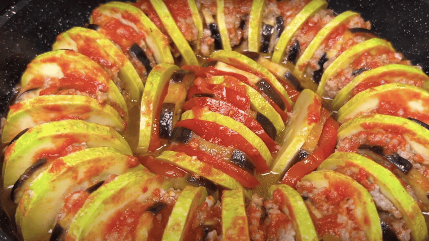 На сковороде соединить нежные кабачки, мясистые баклажаныи ароматный фарш — и получить теплый семейный обед без лишних хлопот. Овощи нарезать кружочками, слегка подсолить баклажаны, подготовить простой томатный соус и сложить все слоями.