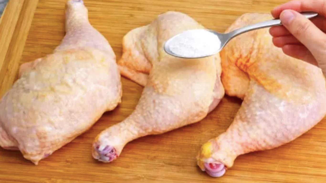 Куриные бедра надрезать с одной стороны, положить в миску и посыпать содой. Втирать соду руками со всех сторон, залить холодной водой и промыть. Оставить на 10-15 минут. Эта процедура делает мясо нежным и позволяет ароматам маринада проникать глубже. После вымачивания слить воду.