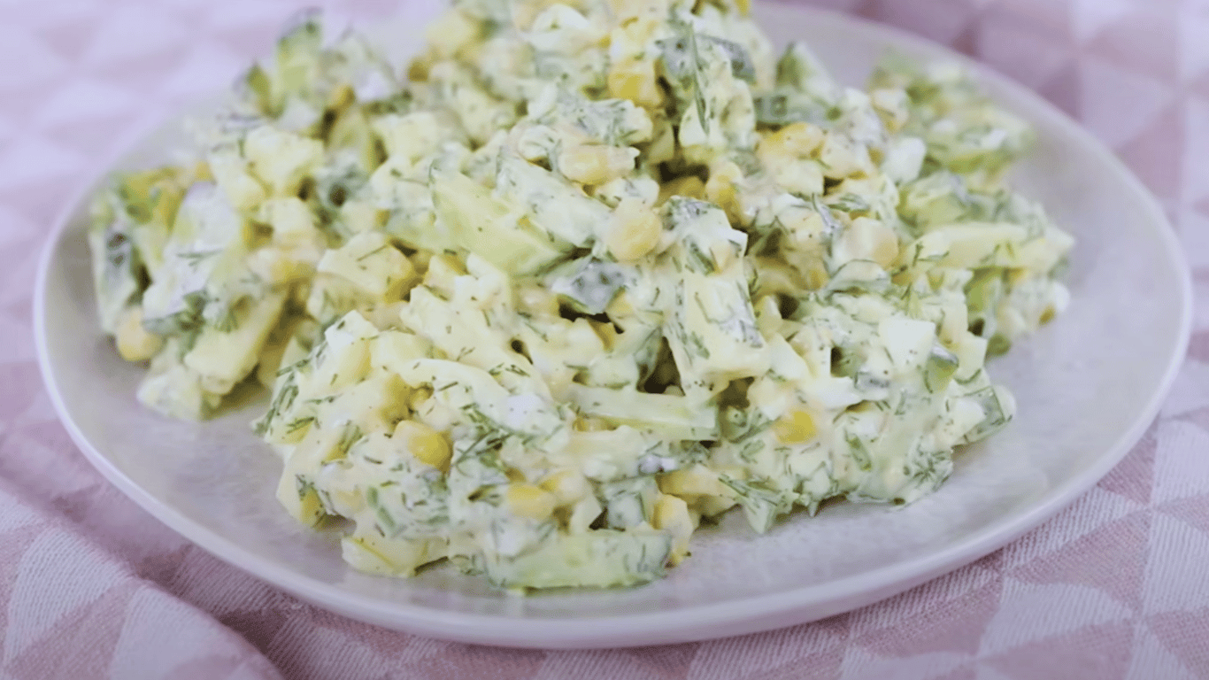 В глубокой миске соединить яйца, огурцы, сыр, кукурузу и измельченный укроп.