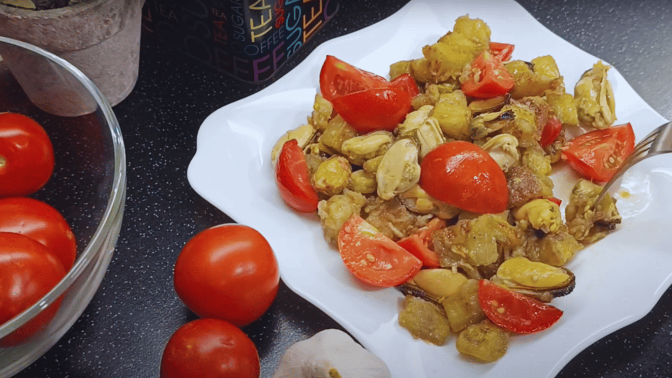 Вкусный салат с баклажанами и мидиями — легкое летнее блюдо, которое удобно приготовить всего за 10 минут. Румяные кубики баклажана, соленые мидии и сладкие черри сочетаются в пикантной соево-чесночной заправке. Идеально для быстрого ужина или перекуса, гармонично сочетается с тостами или отварным рисом.