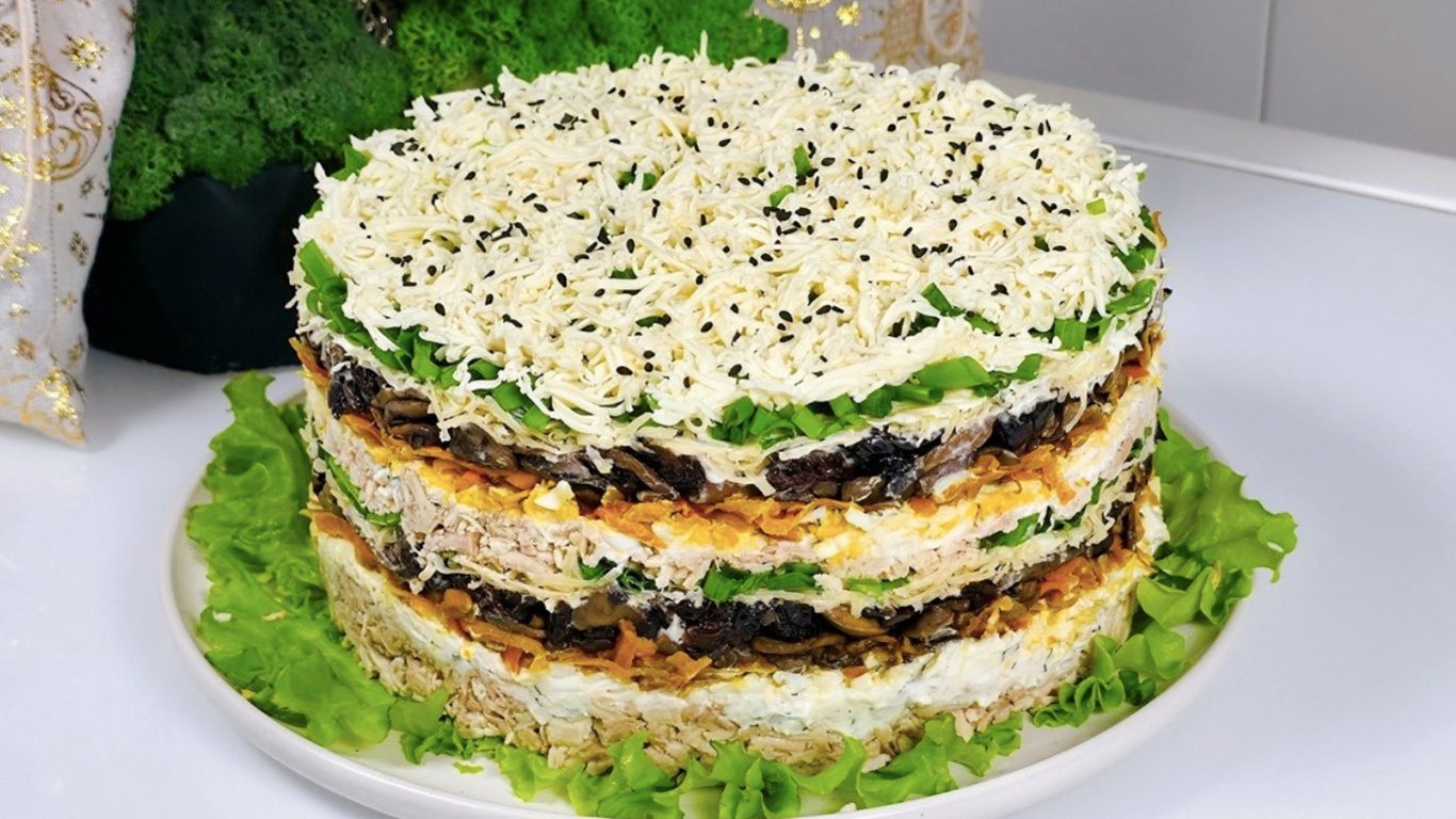 Салат "Снежный лес" — это сочетание нежной курицы, обжаренных грибов и сладкого чернослива в эффектной слоеной подаче. Он выглядит празднично, хорошо держит форму и имеет глубокий, сбалансированный вкус. Такой рецепт часто становится главным блюдом на праздничном столе и всегда собирает комплименты.