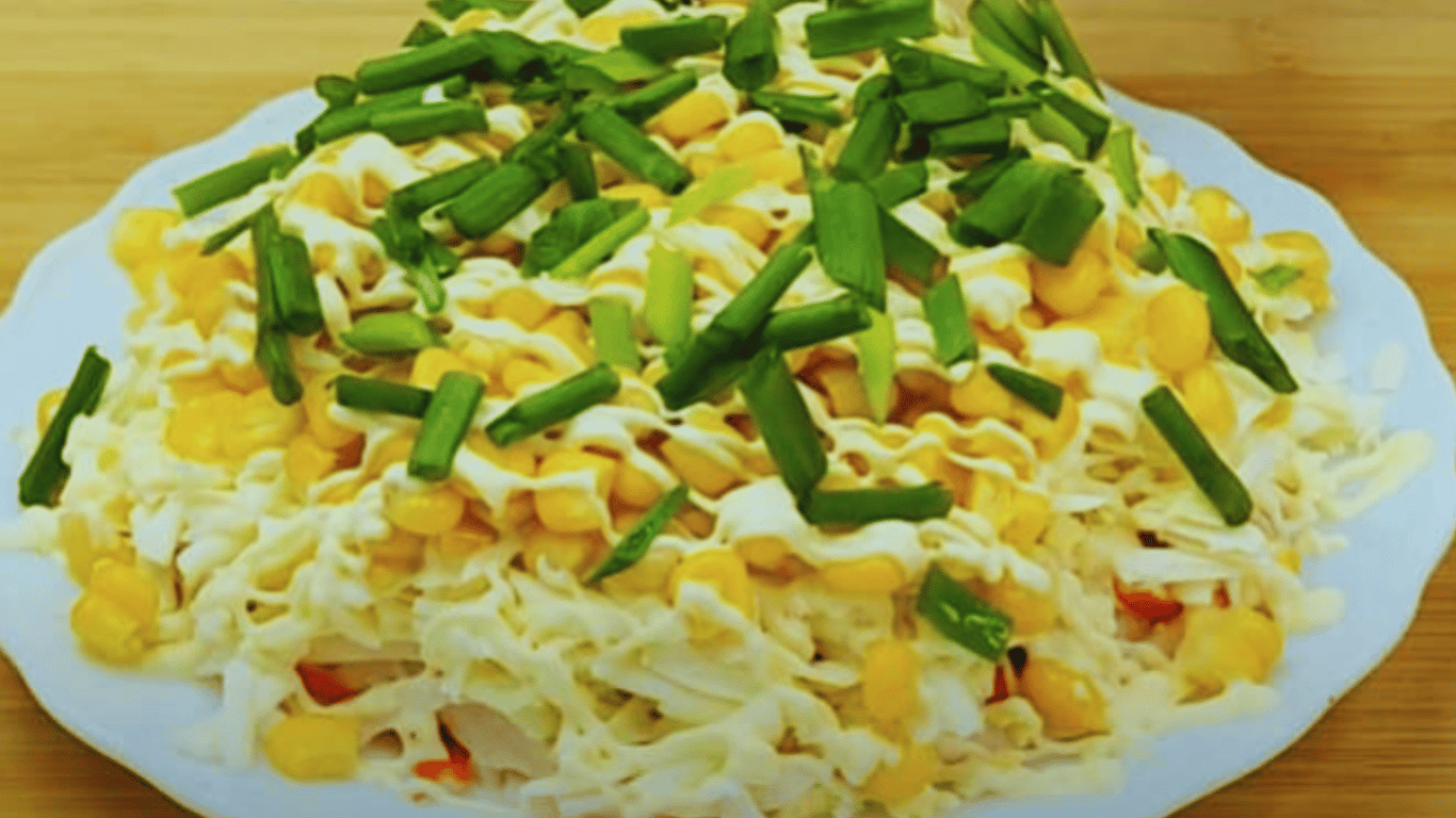 Добавить слой кукурузы, полить майонезом и украсить измельченным зеленым луком.
