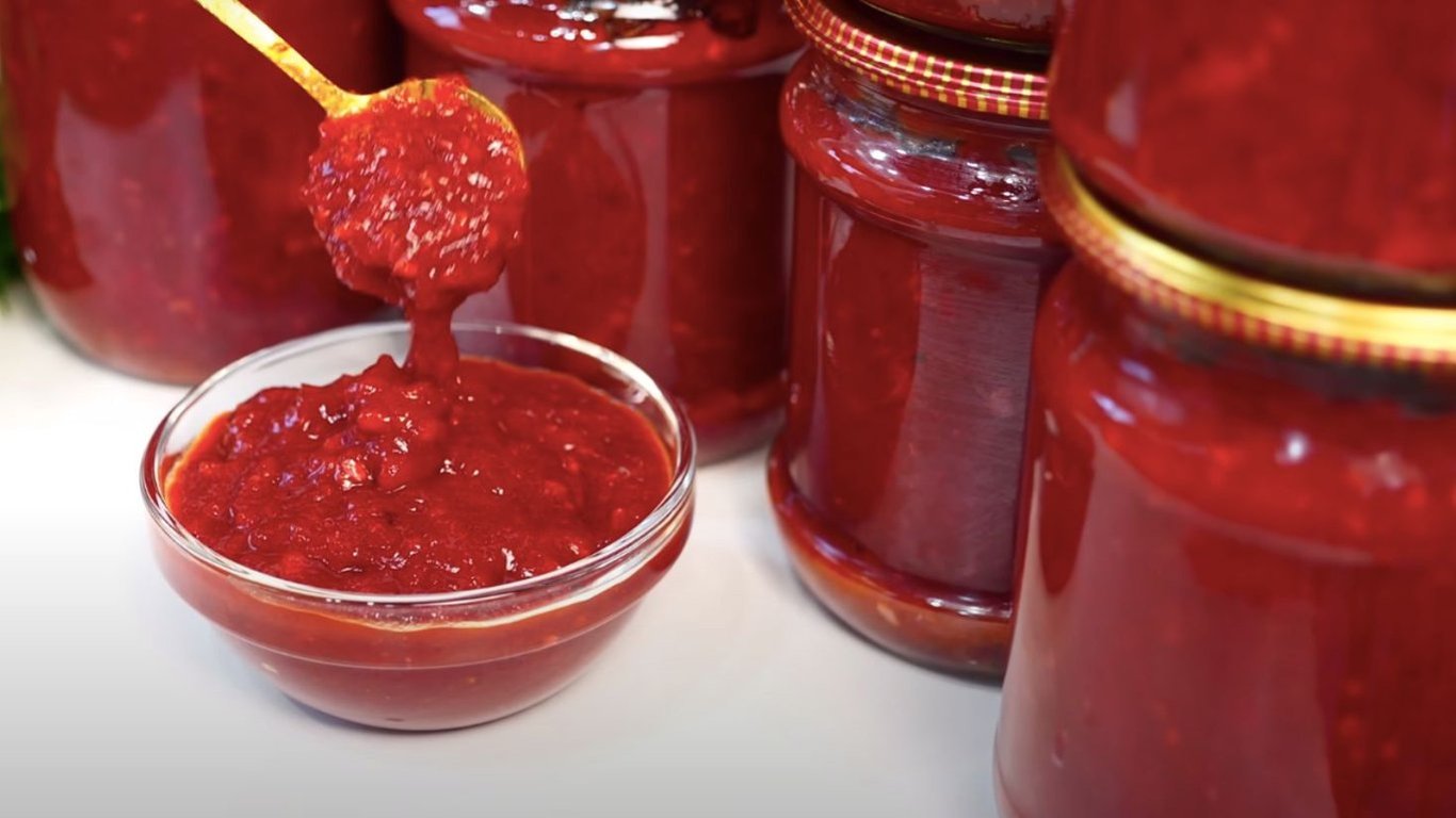 Соус разливаем по стерилизованным банкам и закручиваем.