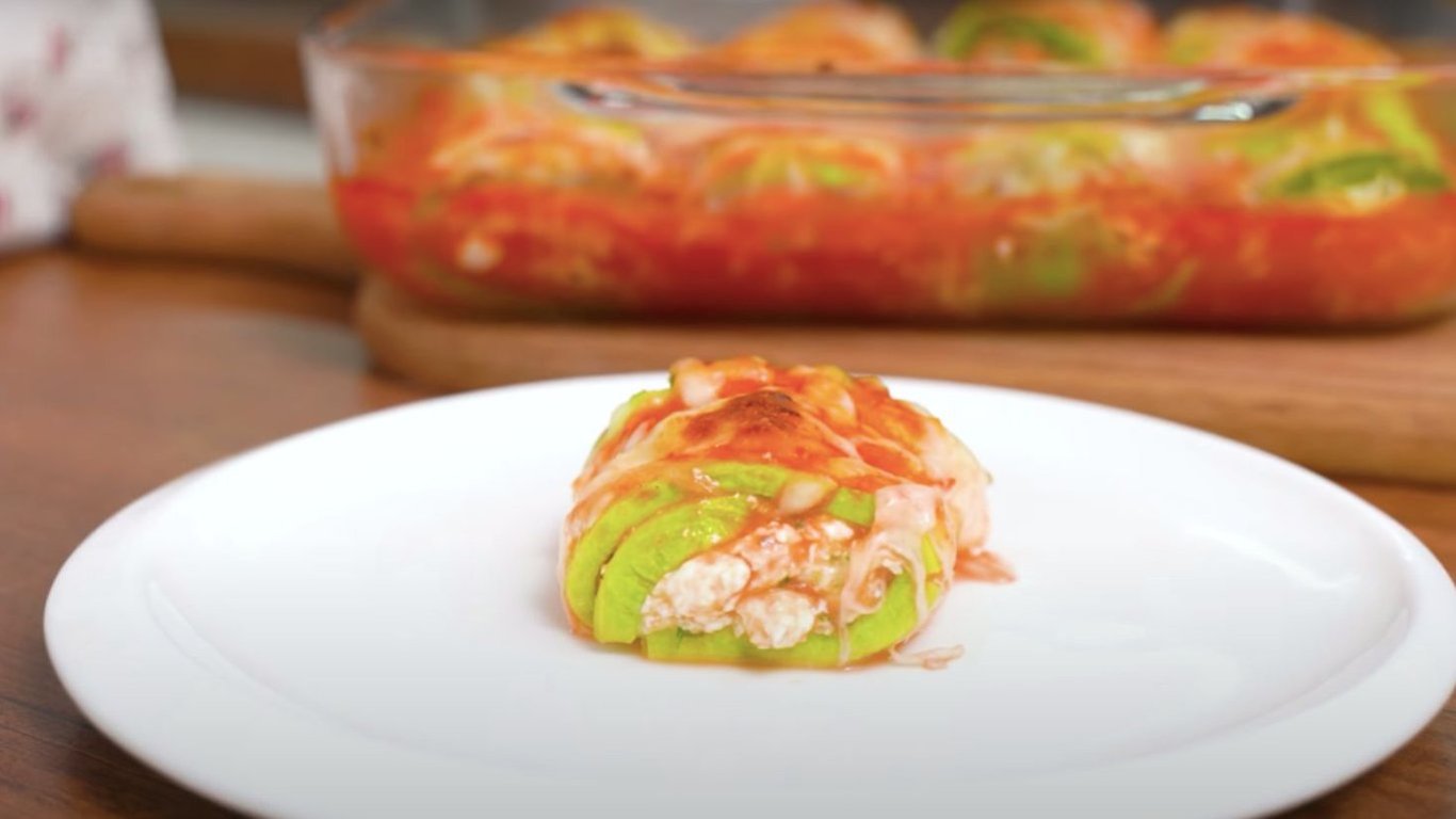 На полоску кабачка положить начинку, свернуть в рулет. Выложить в форму, смазанную растительным маслом.