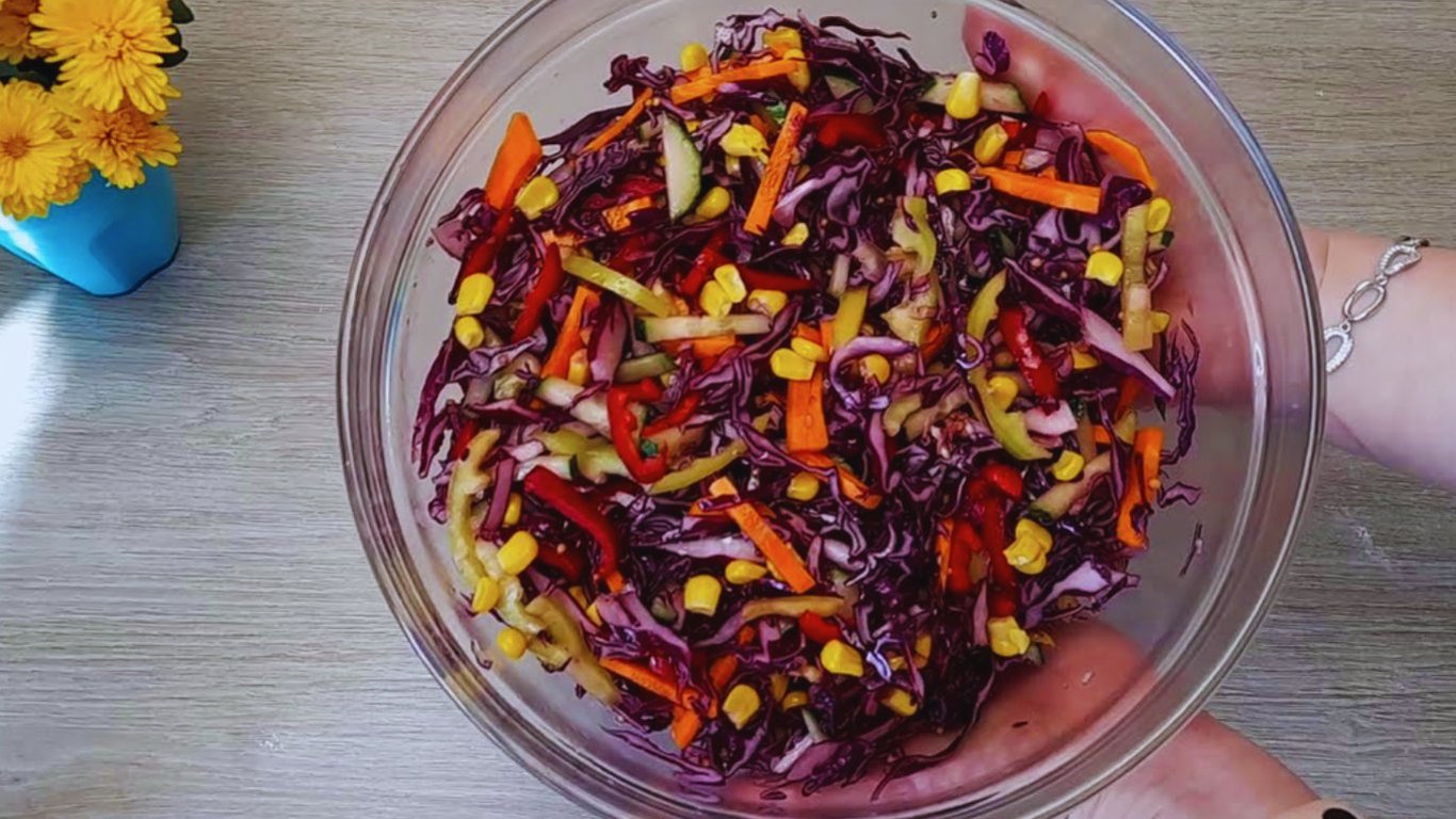 Витаминный салат с синей капустой и кукурузой — легкий рецепт с фото