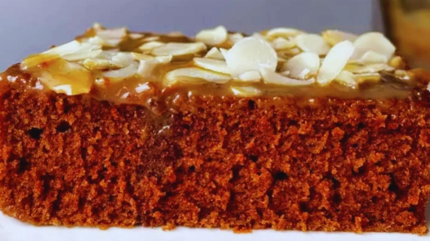 Готовый корж проколоть деревянной палочкой и полить шоколадным соусом. Украсить миндальными хлопьями.