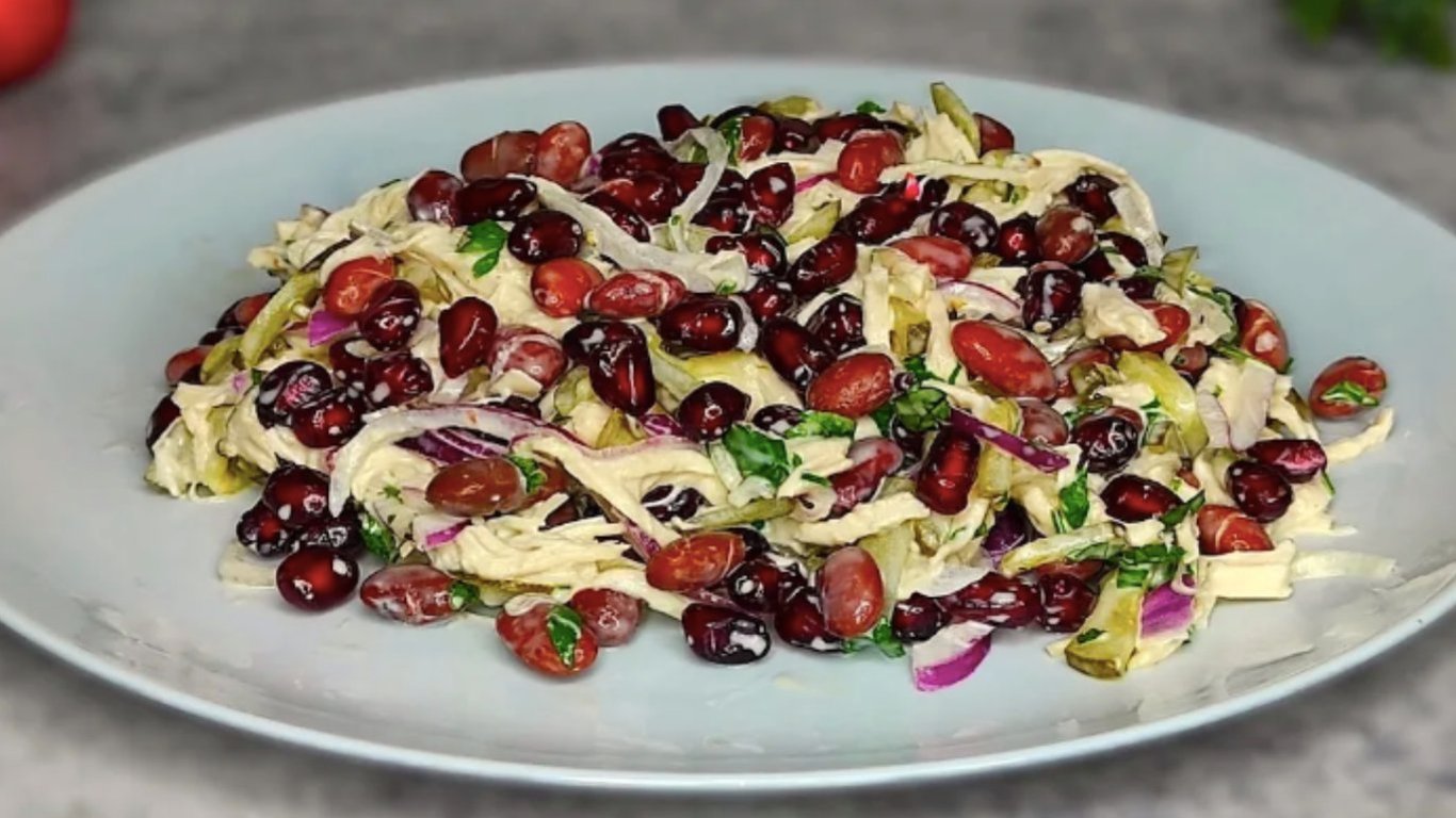 Салат "Дамський каприз №1" поєднує ніжне куряче філе, соковитий гранат та червону квасолю. Легка майонезна заправка робить страву ніжною та ароматною. Рецепт простий у виконанні, а готовий салат виглядає святково і смакує насичено, ідеально для обіду або вечері.