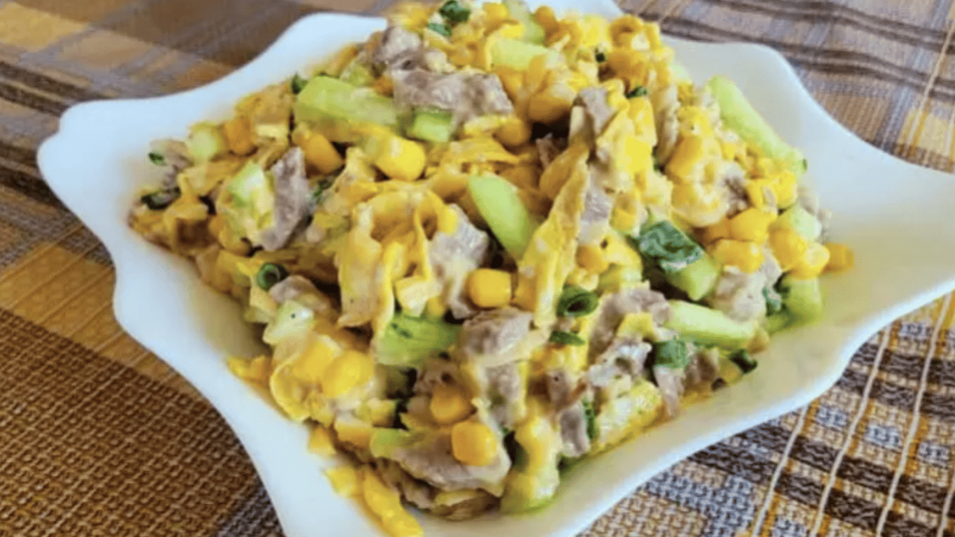 Цей салат — ідеальна заміна звичному Олівʼє, але без надмірної важкості. Літній, свіжий, з ніжним м’ясом, хрумкими огірками та ароматними яєчними млинцями — він підкорює з першої ложки. Готується просто, а виглядає дуже ефектно.