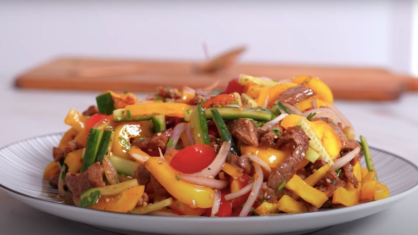 Викладіть у салатник яловичину, болгарський перець, помідори, огірок та цибулю. Додати дрібно нарізану петрушку.