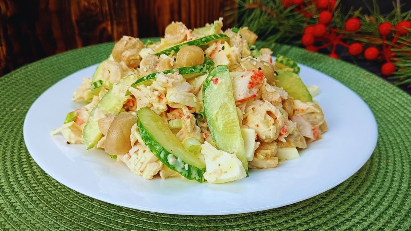 Цей салат завжди рятує, коли потрібно швидко приготувати щось смачне та ефектне. Поєднання ніжного курячого філе, соковитих крабових паличок і маринованих грибів створює збалансований, насичений смак, який точно сподобається вашим гостям. Це універсальна страва, що підходить і для буднів, і для святкового столу.