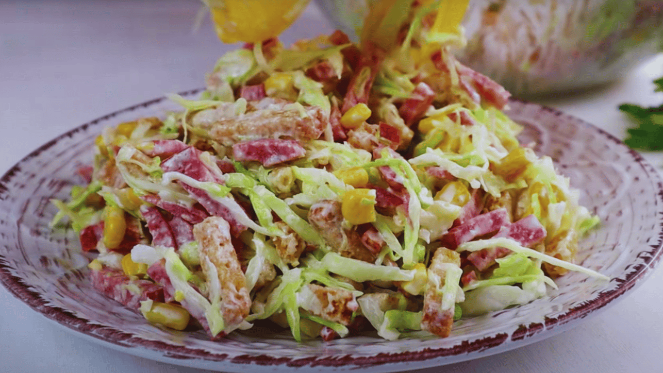 Салат "Леді" — це той самий випадок, коли з кількох інгредієнтів виходить щось справді апетитне. Ніжна капуста, соковита кукурудза, ароматна копчена ковбаса та хрусткі сухарики створюють ідеальне поєднання. Такий салат готується за лічені хвилини.