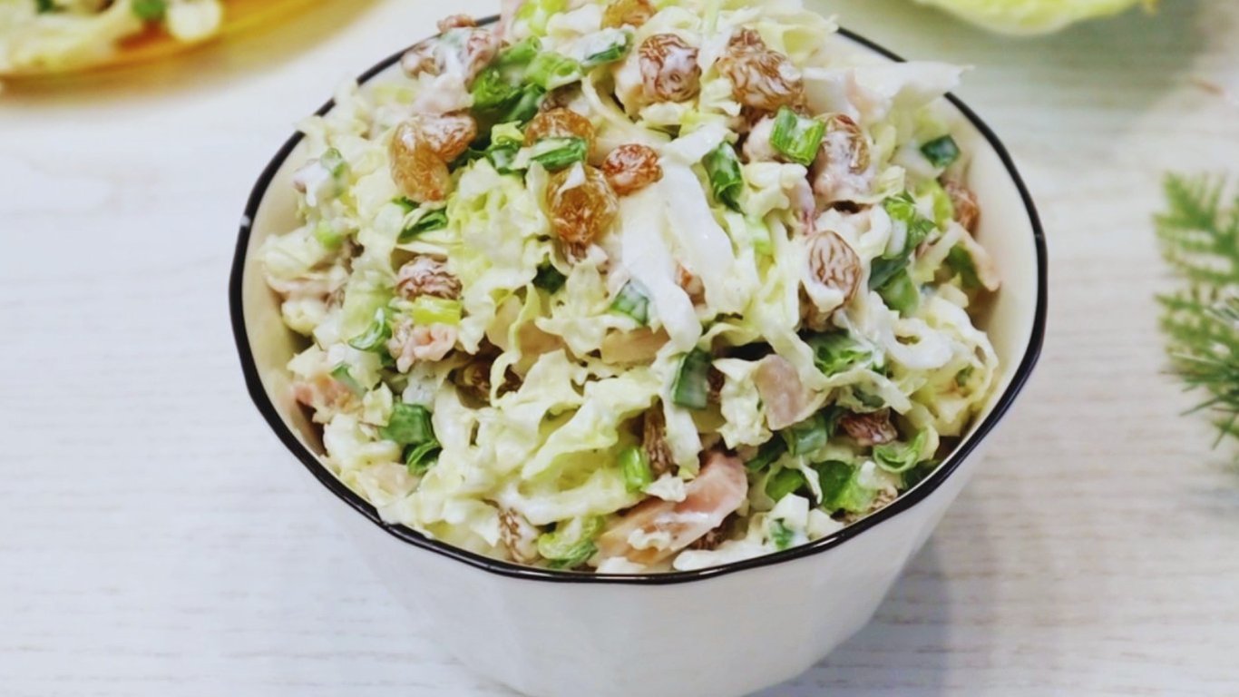 Салат з пекінською капустою та копченою куркою поєднує ніжність овочів, аромат копченого м’яса та солодку нотку родзинок. Легкий у приготуванні, свіжий і дуже смачний — ідеальний варіант для швидкого обіду або святкового столу.