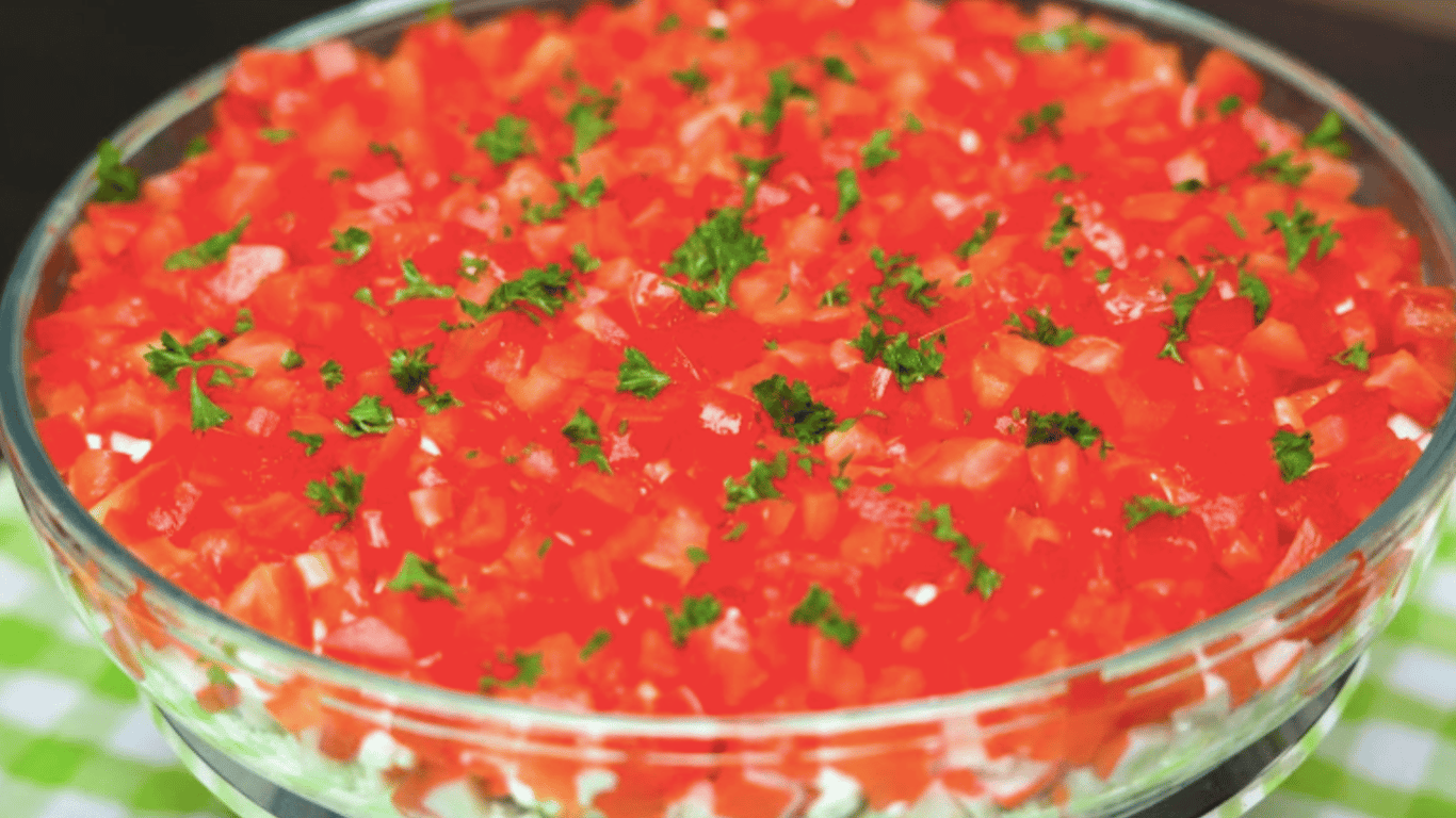 Помідори нарізати дрібними кубиками, попередньо видаливши насіння. Це дозволить зберегти структуру салату та запобігти зайвій волозі. Викласти томати третім шаром. За бажанням прикрасити свіжою зеленню. Страву можна подавати одразу або зберігати в холодильнику під плівкою до подачі.