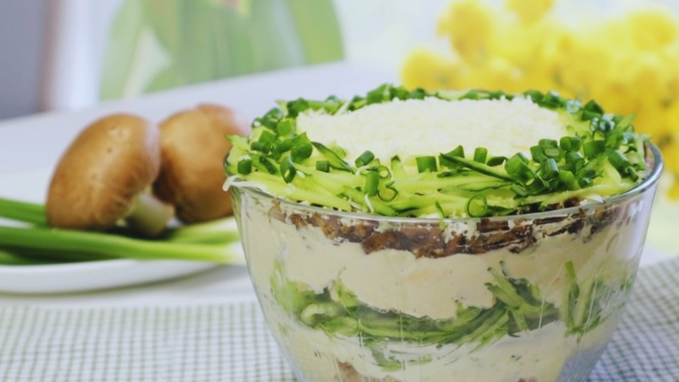 Зверху прикрасити зеленню та огірковими скибочками. Перед подачею поставити салат "Жозефіна" в холодильник на 30–60 хвилин — так усі смаки з’єднаються, а текстура стане ще ніжнішою.
