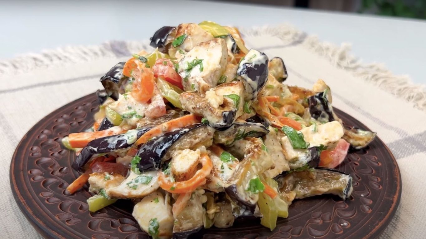 Сезонний баклажановий салат з грузинськими нотами — овочева страва з куркою