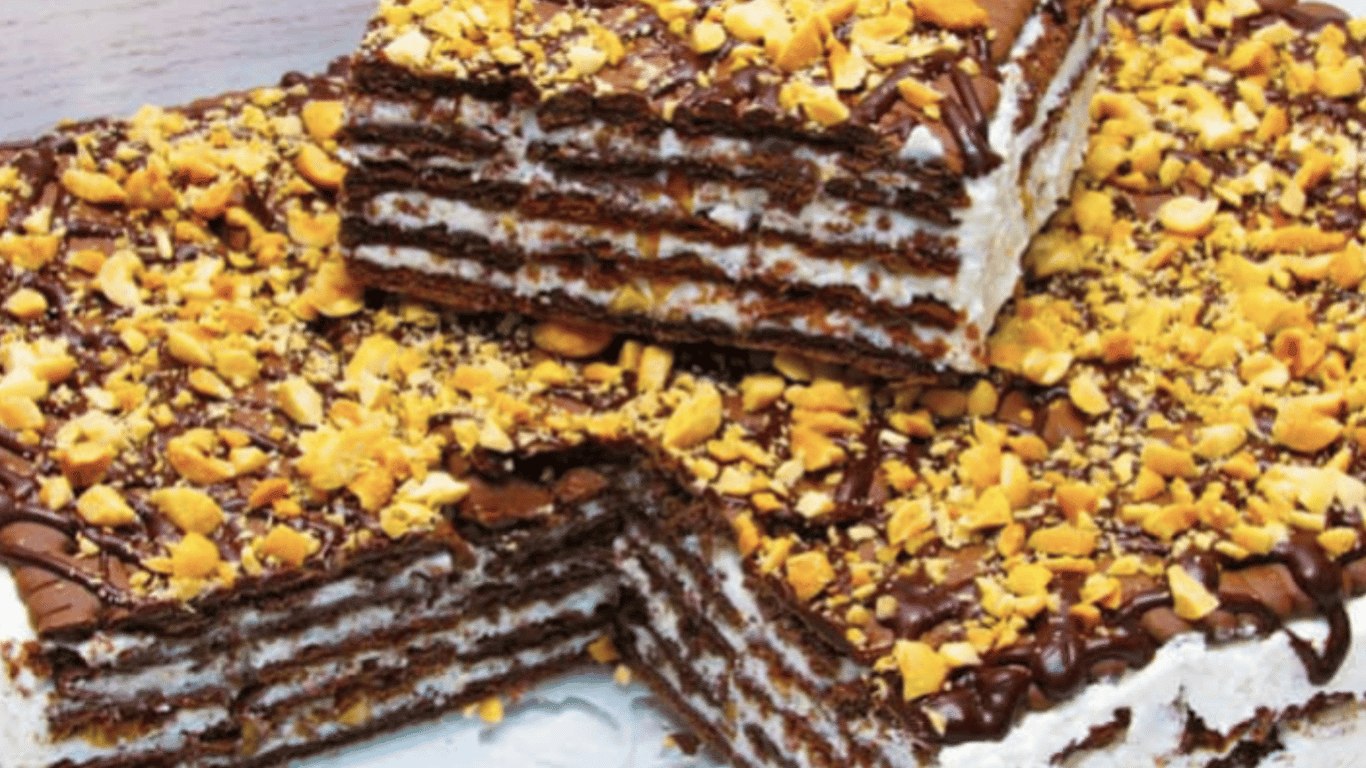 Повторювати шари, чергуючи печиво, крем та горіхи, поки не закінчаться інгредієнти. Зазвичай виходить близько п’яти шарів печива і чотирьох шарів крему.