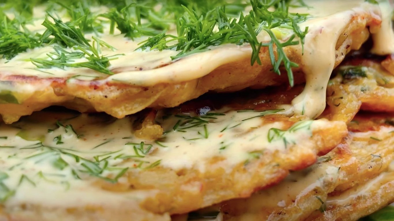 Соус робимо з домашнього майонезу, зеленої цибулі та кропу. Лопаткою рівномірно розміщуємо по всьому картопляному млинці. Зверху кладемо ще один млинець і повторюємо, ті самі дії, що з попереднім. І так доти, поки всі млинці не закінчаться. За бажанням останній млинець можна посипати зеленню.