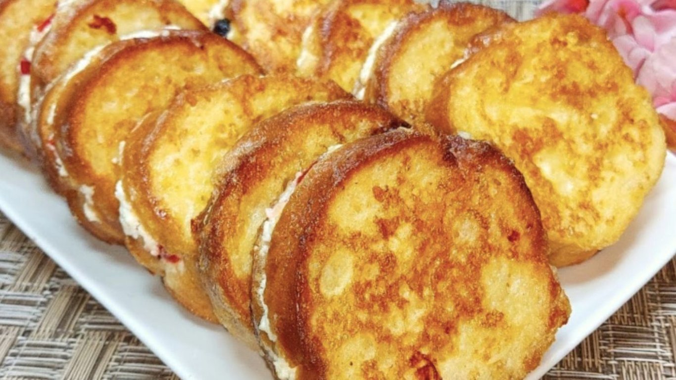 Наповнити підготовлені шматки батона сирною начинкою. В окремій мисці збити яйця з молоком і цукром. Обмакнути кожен бутерброд у цю суміш. На сковороді розтопити вершкове масло й обсмажити бутерброди до золотистого кольору з обох боків.