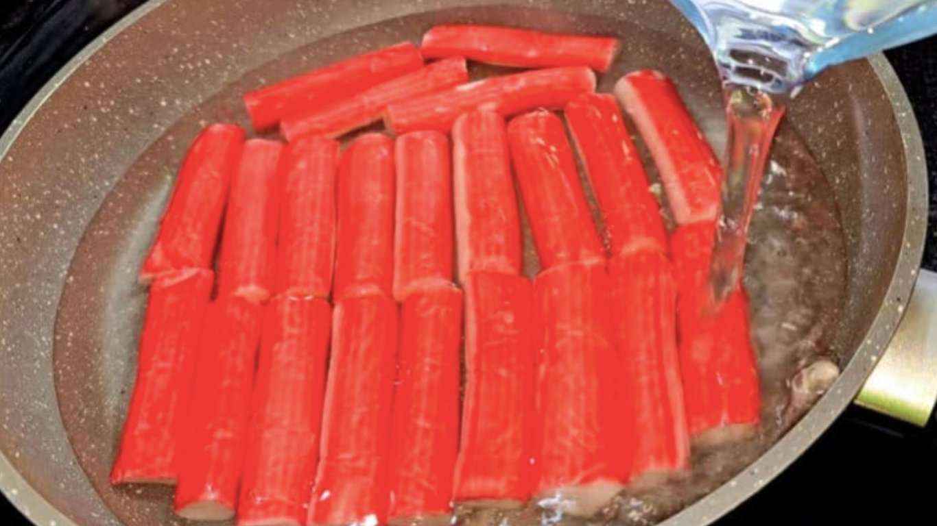 Крабові палички викласти у глибоку миску, залити окропом і залишити приблизно на 2–3 години, щоб вони стали м’якими та еластичними. Після цього акуратно розгорнути кожну паличку руками у тонкі пласти, намагаючись не порвати структуру.