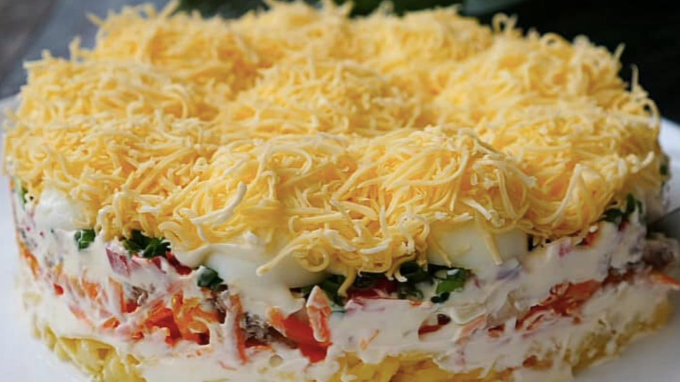 Цей салат "Яна" одразу привертає увагу — яскравий, апетитний і дуже ніжний на смак. Поєднання сардини, овочів, яєць і сиру настільки гармонійне, що страва стає справжньою окрасою святкового столу. Він не тільки ситний, а й має приголомшливий вигляд — гості точно попросять рецепт.