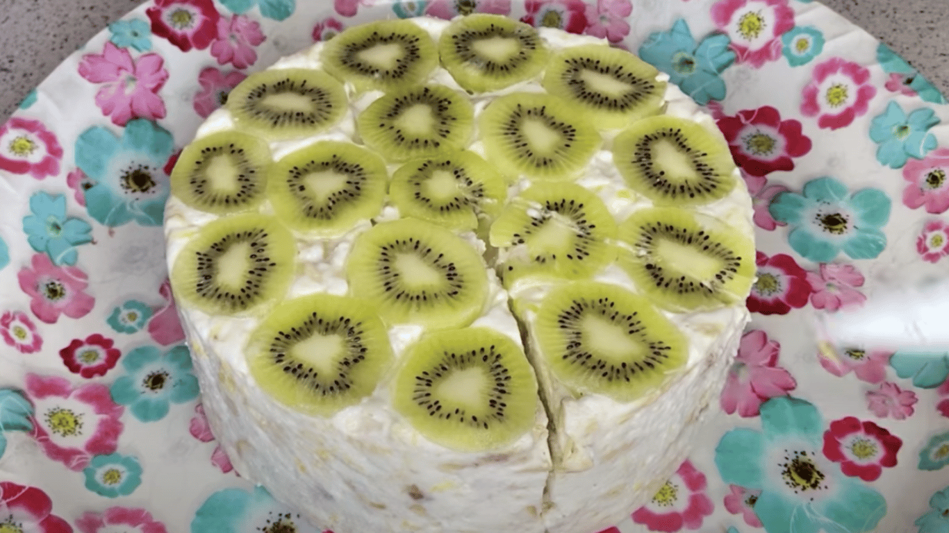 Цей ніжний торт без випічки — справжня знахідка для зайнятих господинь. Усього кілька доступних інгредієнтів — печиво, сметана й фрукти — а результат перетворюється на повноцінний святковий десерт. Завдяки желатину він прекрасно тримає форму, а кремова текстура та фруктова свіжість роблять його улюбленцем як дітей, так і дорослих.