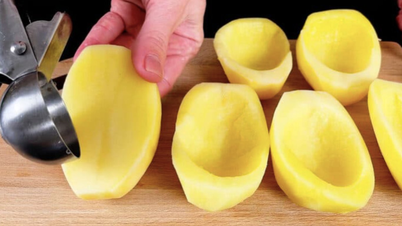 Картоплю очистити, розрізати навпіл і ложкою акуратно видалити серединку, формуючи човники. В окремій мисці змішати олію, сіль і паприку, обмазати картоплю з усіх боків та викласти у форму для запікання. Випікати в духовці, розігрітій до 180°C, приблизно 20–25 хвилин.