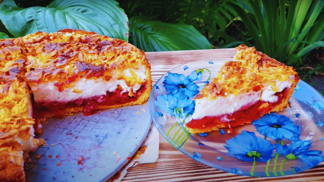 Випікати пиріг у розігрітій до 180 °C духовці протягом 40–50 хвилин, поки верх не стане рум’яним, а крем — стабільним. Остудити перед подачею, щоб крем добре тримав форму.