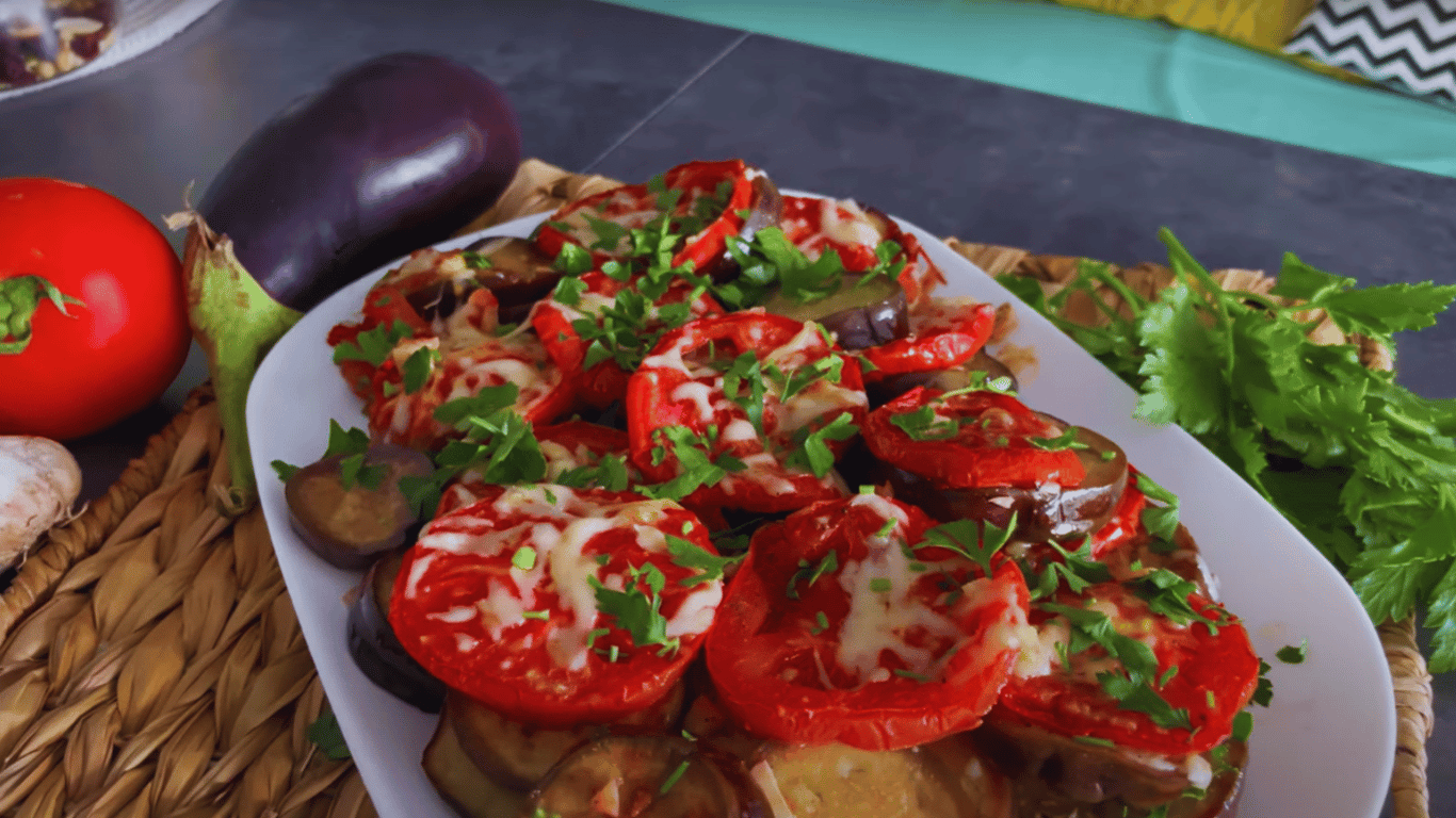 Ця запечена закуска з баклажанів — справжня знахідка для вечері, святкового столу або перекусу без м’яса. Апетитні кружечки баклажанів поєднуються з томатами, часником, сиром і ароматною зеленню, утворюючи легку, але ситну страву. Запікається вона в духовці без зайвих зусиль і чудово смакує як гарячою, так і охолодженою.