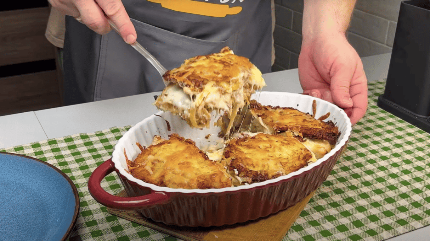 Ситна запіканка з дерунів із м’ясом та ніжним соусом бешамель — це страва, яка ідеально підходить для сімейної вечері. Рум’яні деруни у поєднанні з соковитою куркою, грибами та вершковим соусом утворюють гармонійний смак, що нагадує домашній затишок. Приготування не потребує багато зусиль, а результат неодмінно порадує всю родину.