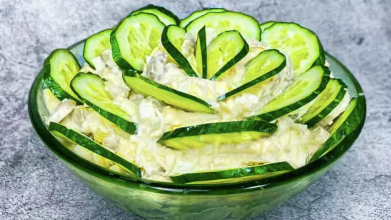 Готовий салат викласти у салатник, сформувати акуратну гірку. Огірок нарізати тонкими пластинами та викласти по колу, імітуючи пелюстки квітки для святкової подачі.
